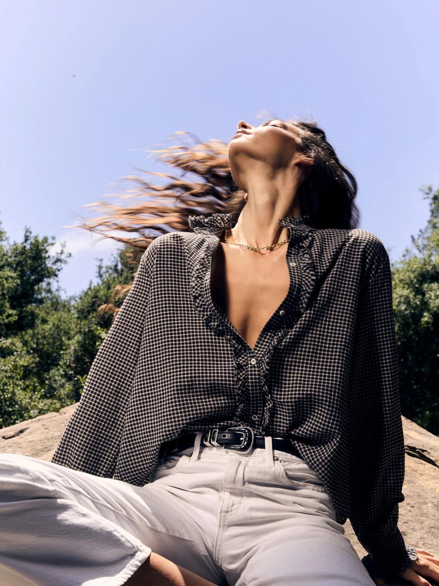 Checkmate. Amelie is new this season in our cotton gingham check with added stretch for ease of comfort. This button-front shirt features raw edge ruffle details throughout the neck, front placket, and cuffs.