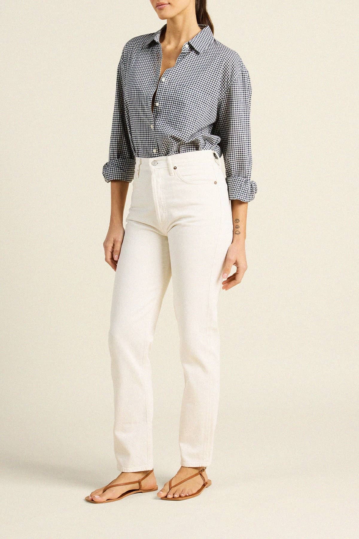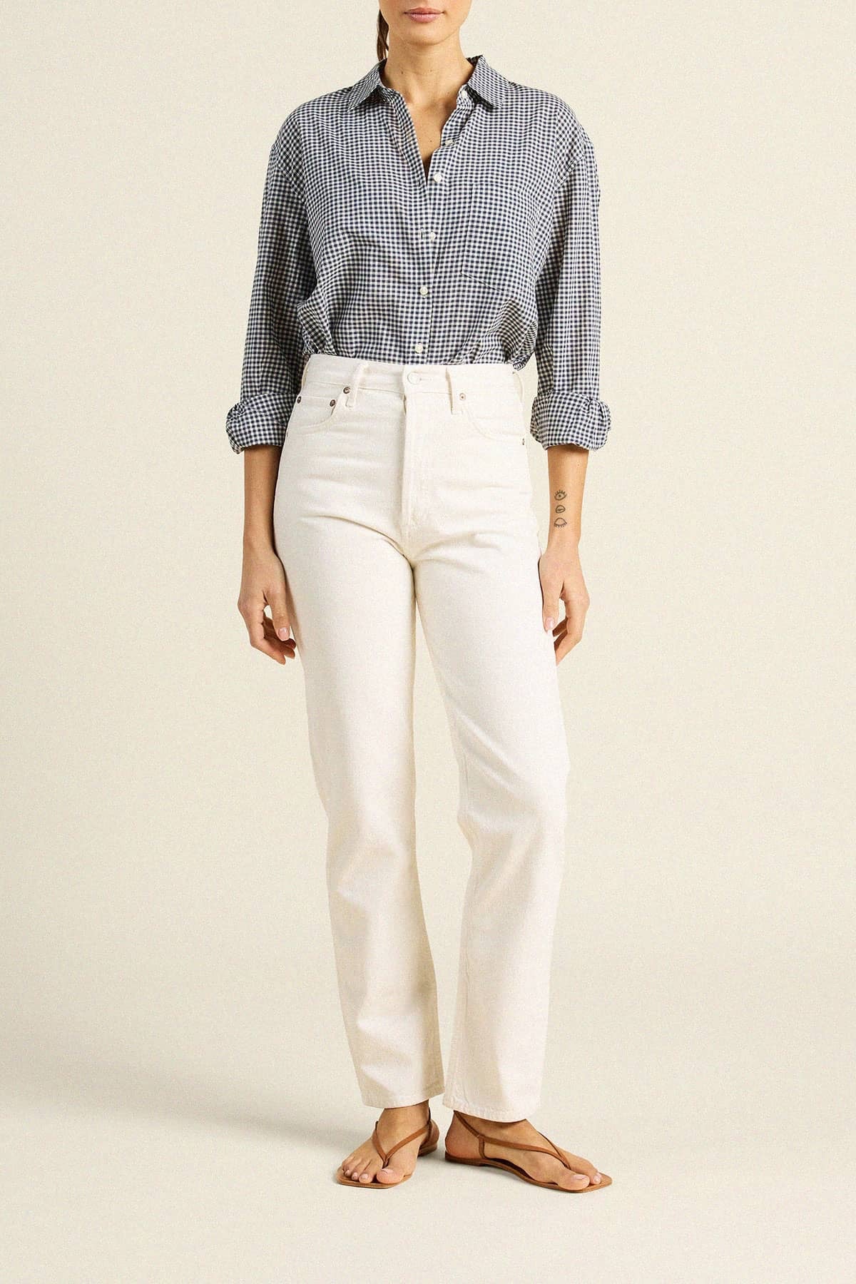 The Blake oversized boyfriend shirt is a button-down meant to live in your wardrobe for years. It truly gets better with each wear, growing softer every wash. This shirt has an oversized boyfriend fit completed with antique white buttons and a single chest pocket. Made from our cotton and shown here in Inkwell Gingham.