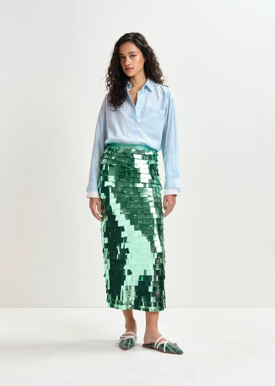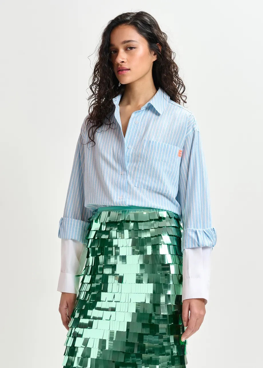 100% cotton oversized shirt features a classic collar, button fastening, and dropped shoulders. Designed with double cuffs, and a chest pocket with "E" embroidered detail; a versatile staple with playful touches.