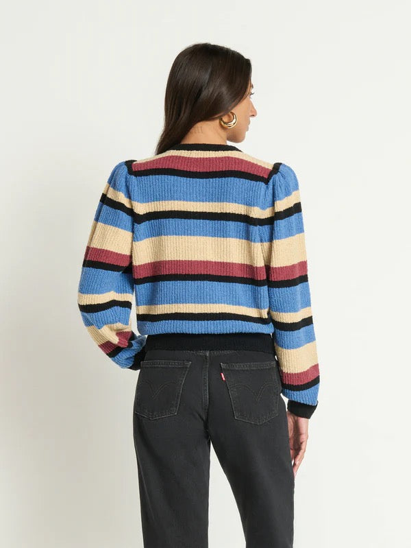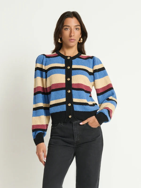 A casual yet chic cardigan that you'll return to year after year. Knit from our plush Pima Velour, the Carmela has a relaxed fit, crew neck, bishop sleeves, and dome gold buttons. This one comes in Velour Multi Stripe.