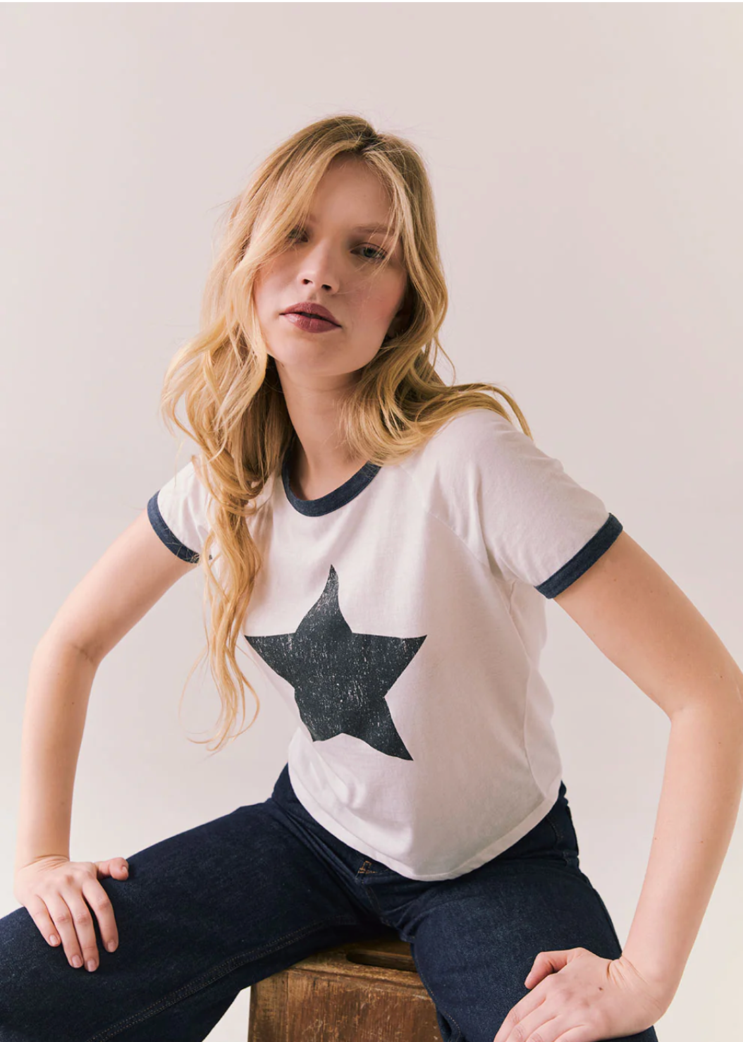 The Classic Star Tee in soft white brings throwback ringer energy with a bold black star graphic and effortless cool.