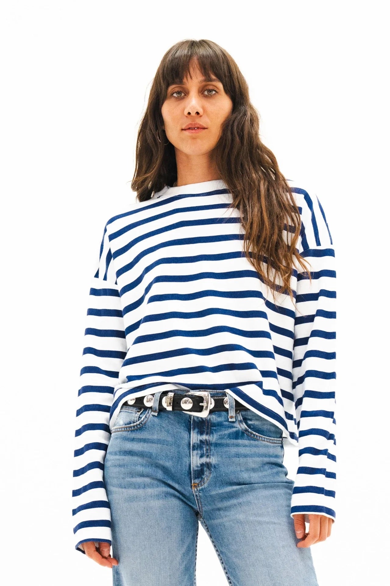 A classic striped essential with a modern cropped silhouette. Designed with a relaxed fit and soft hand feel, this long sleeve tee is crafted from 100% American knit cotton for everyday comfort and breathability. An easy layering piece that pairs effortlessly with denim.Fit & Measurements
