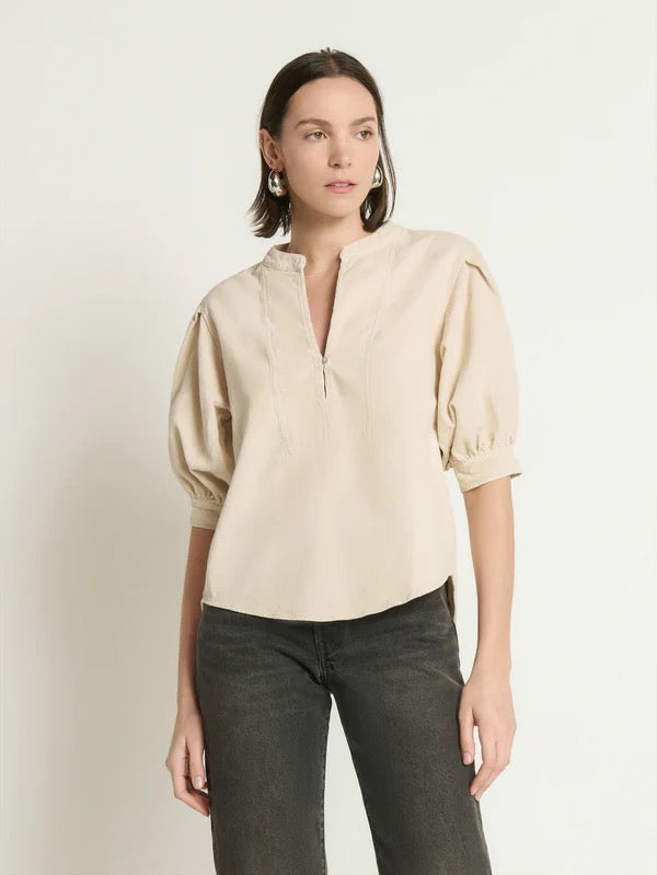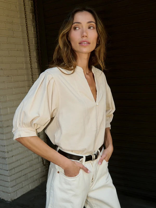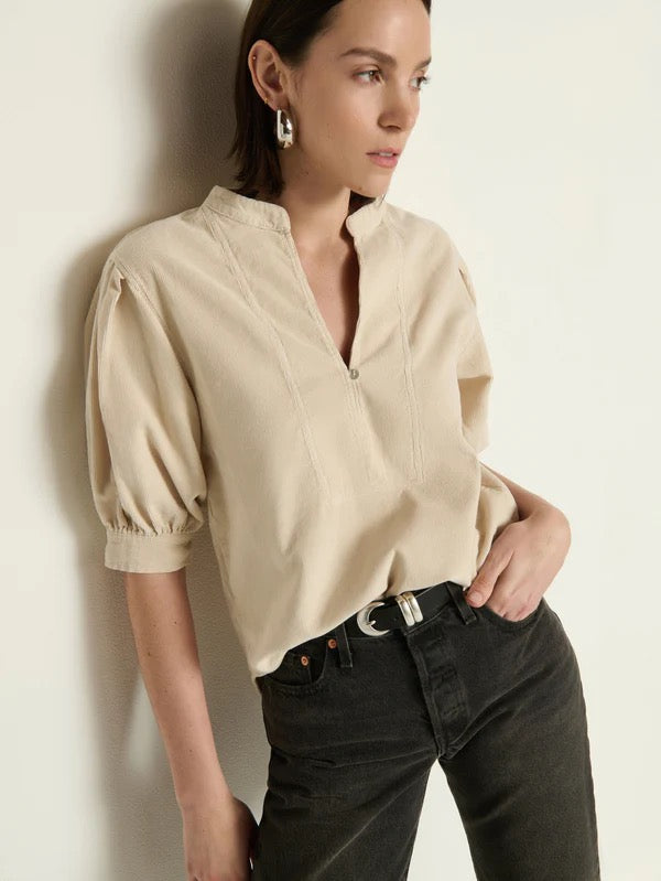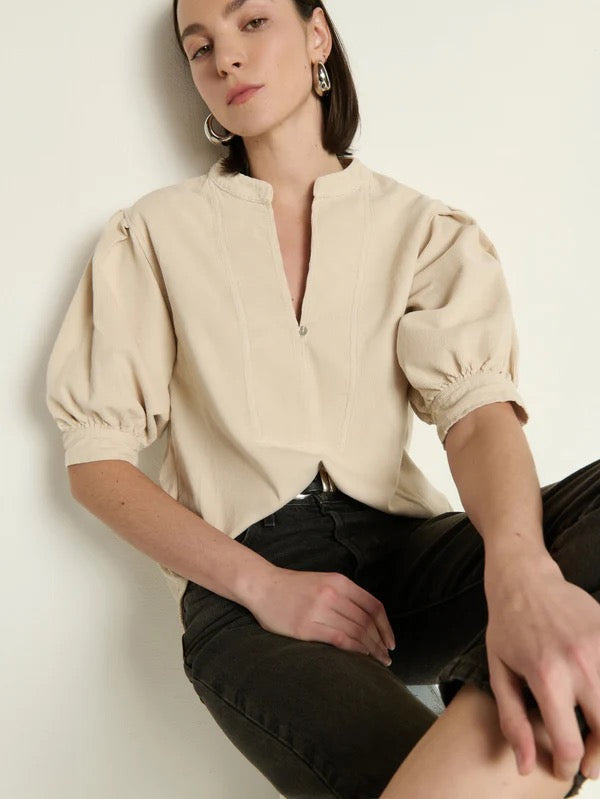 Not your average neutral. This collared corduroy top buttons at the chest and includes structured, elbow-length puff sleeves—a year-round staple, if you ask us. This one comes in Moonbeam.