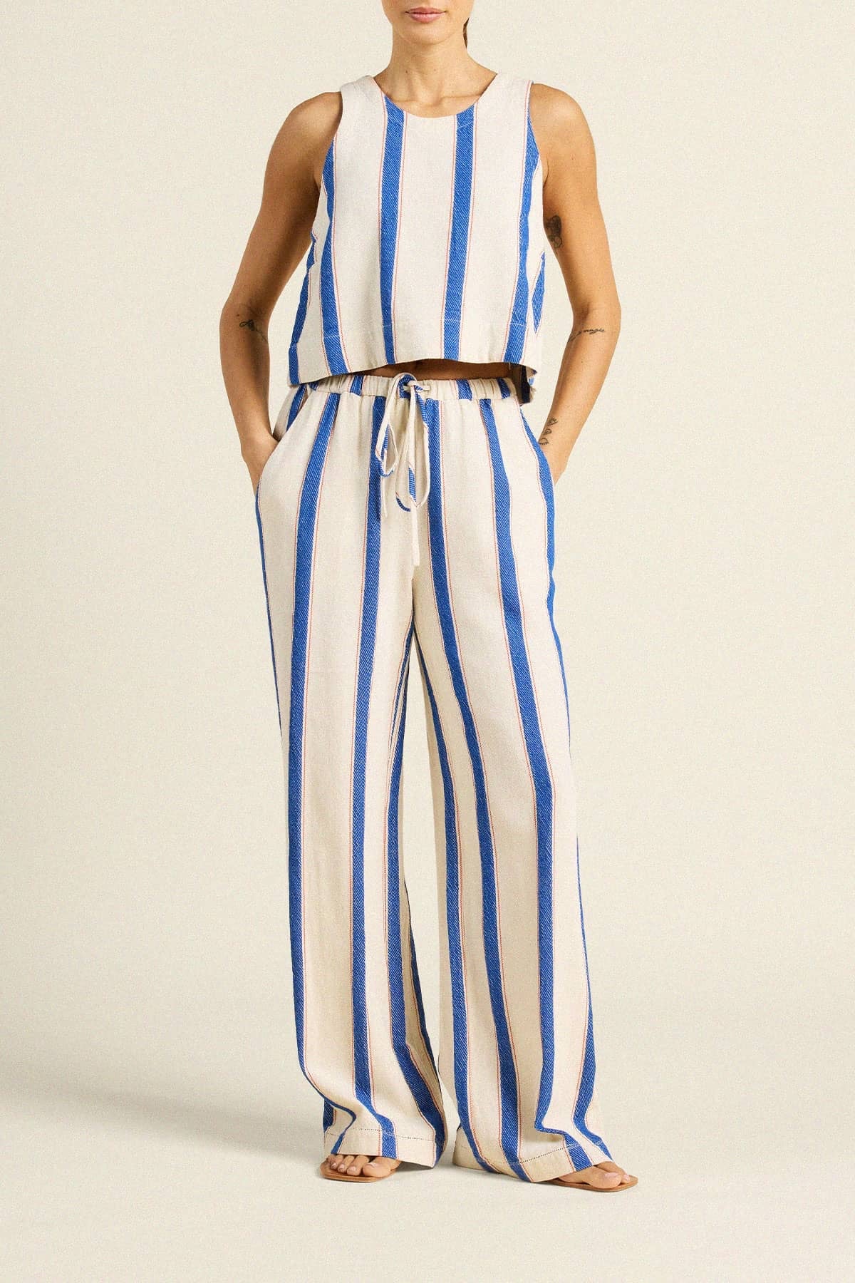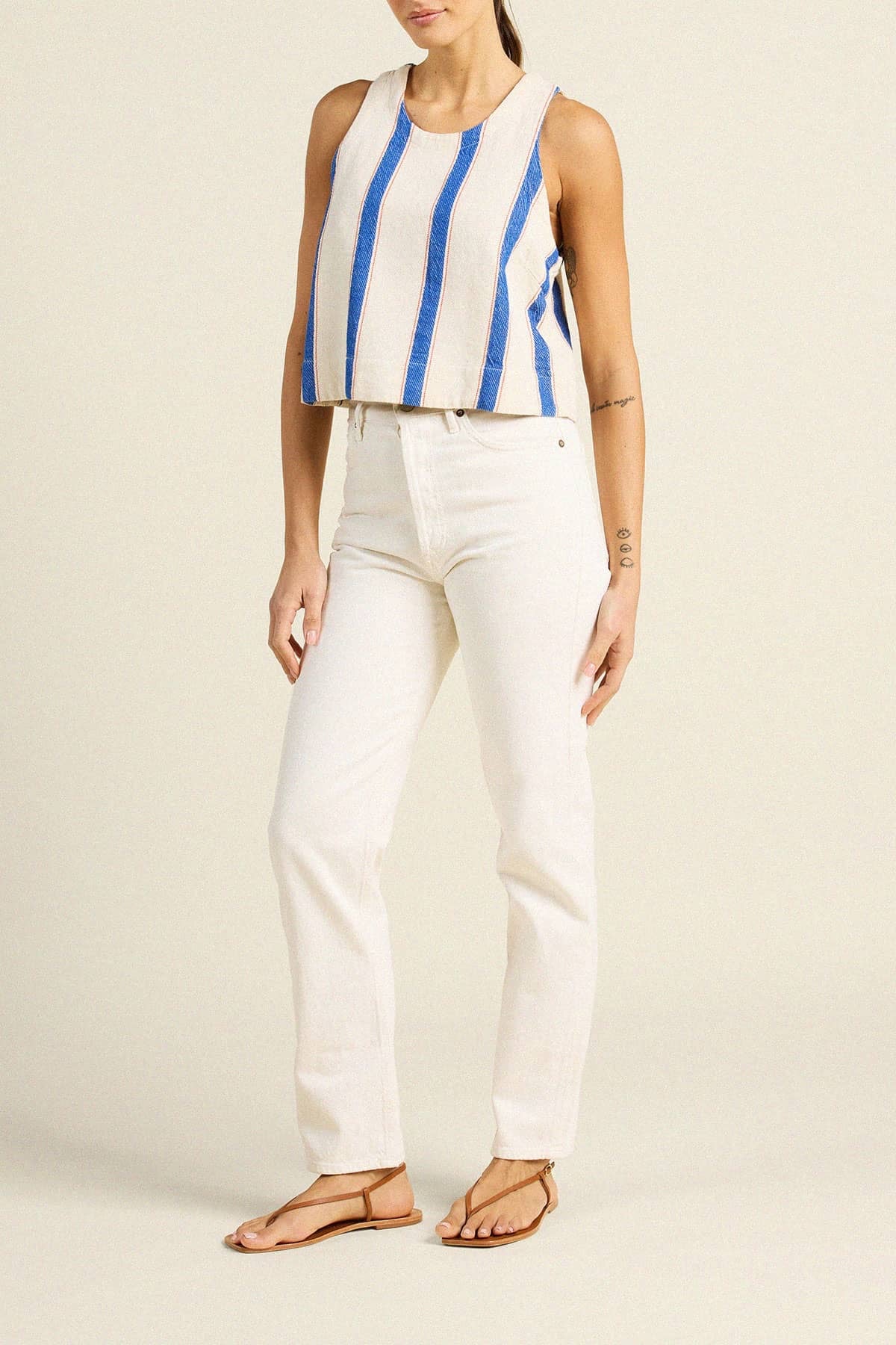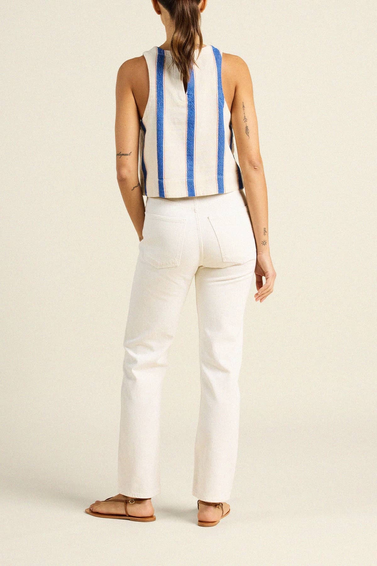 The Esther is our new summer tank. Slightly cropped with a rounded neckline and buttoned back closure, designed for warm summer weather in our custom lightweight Trovata linens. Modern yet classic with cleanly finished hems, bust darts, and seamless throughout. A streamlined silhouette on its own or part of a softly structured linen set. Designed to be worn with matching Everett Short, Leigh Trouser Pant or loose jeans for a relaxed, polished look. Shown here in Awning Stripe and made from our cotton twill.