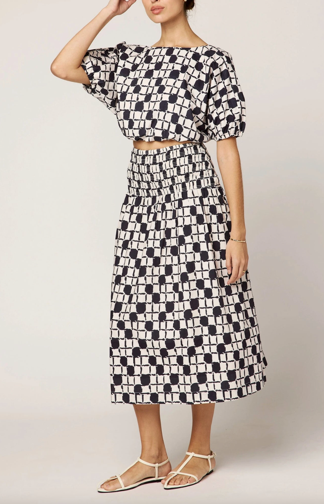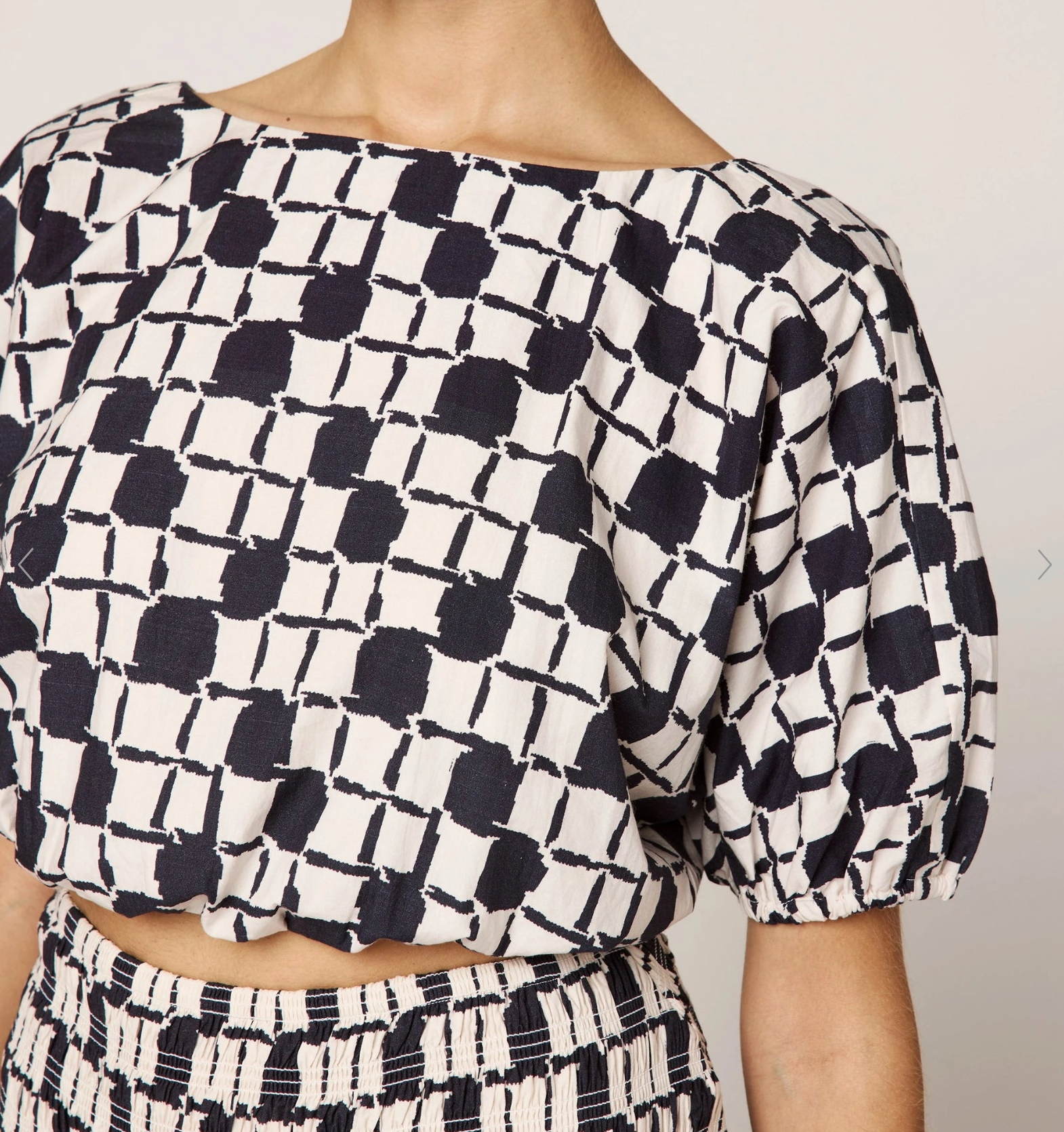 Crafted from 100% GOTS-certified organic cotton, the Helena Top features a bold geometric print, voluminous puff sleeves, and a flattering cropped silhouette. Designed with a scoop neck front, V-neck back, and delicate button detailing, it brings both charm and versatility to your wardrobe. Pair with the Melanie Midi Skirt for a matching set that’s effortlessly chic and polished.