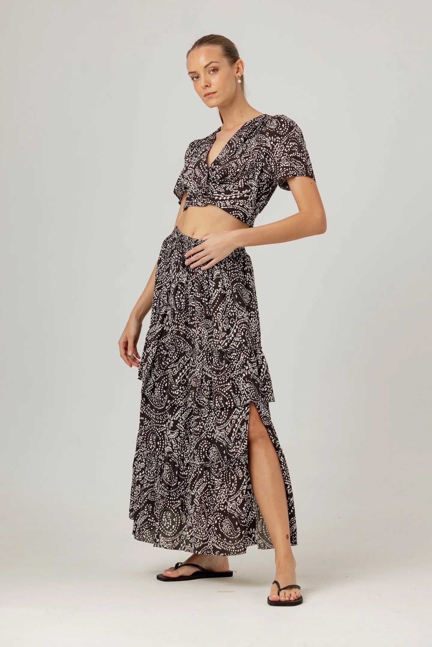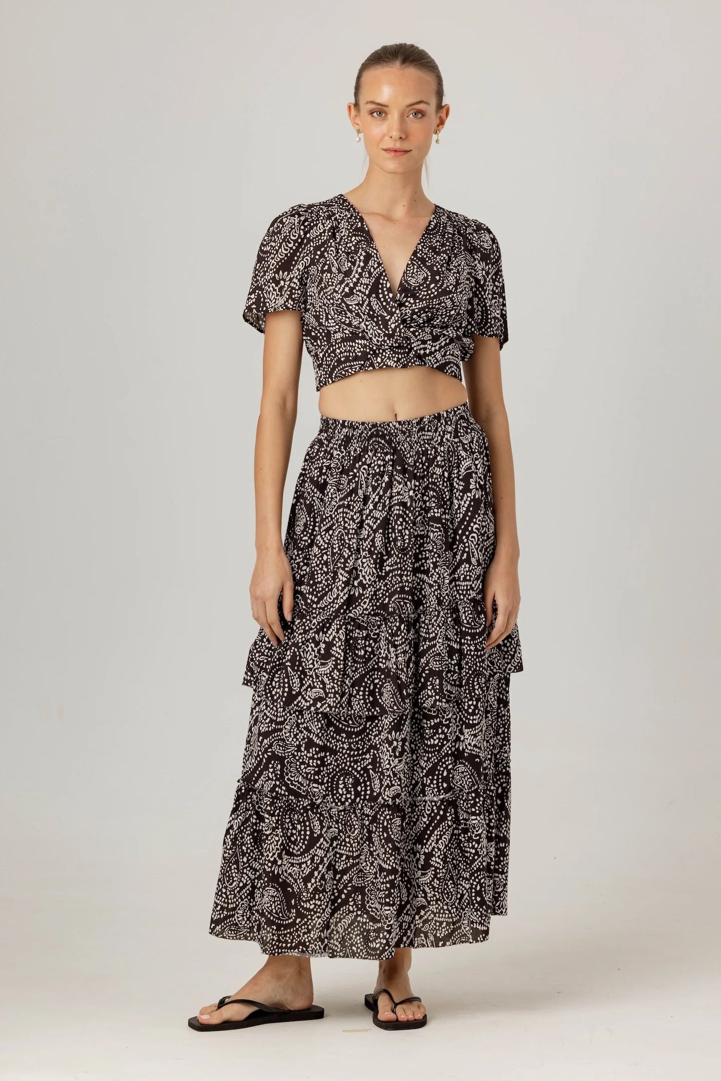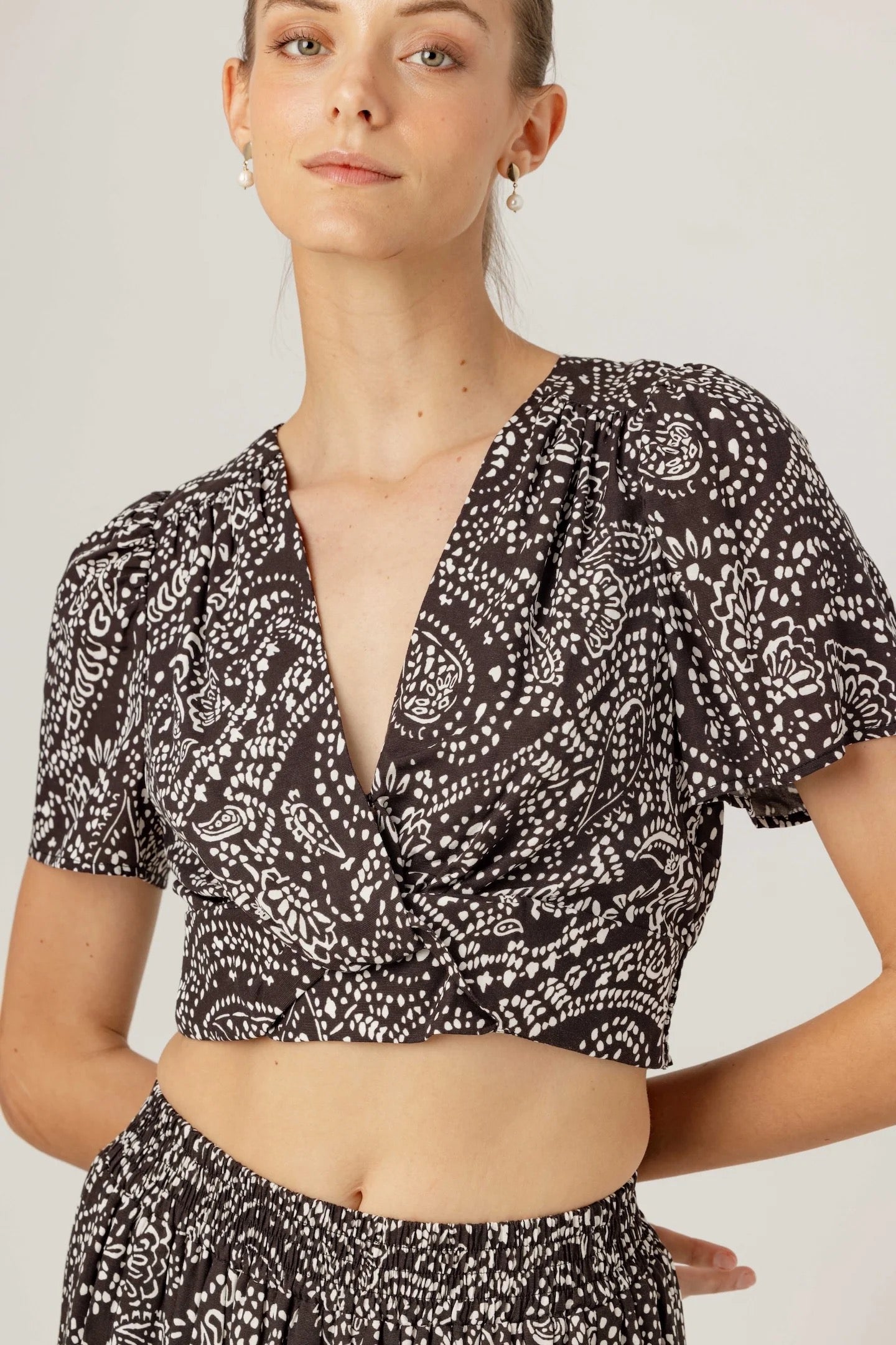 A nod to nostalgic summer prints, this vintage bandana-print crop top features a deep V neckline that twists to elegantly frame the collarbone. A smocked back offers a flexible and flattering fit. Designed to hit just above most wearers’ belly buttons, it pairs perfectly with the matching Yara Skirt for a standout, coordinated look. Effortlessly cool and endlessly wearable — your go-to for sun-soaked days.