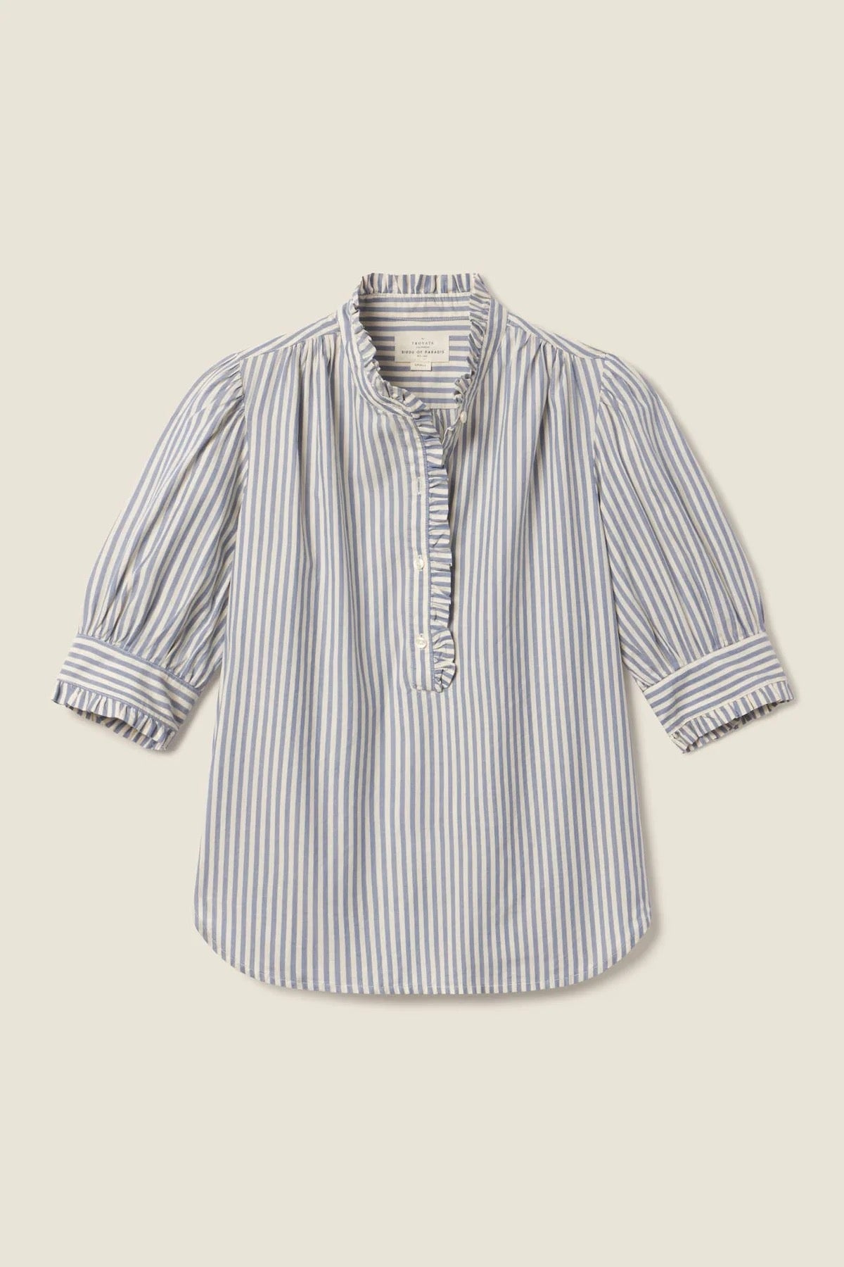 The Noah Shirt is our classic button-down shirt with added feminine details. The standup collar and center front button placket have self-fabric ruffle details. Half Sleeves gather into cuffs with ruffle detailing. Shown here in Oceanview Stripe. Made from our soft cotton.