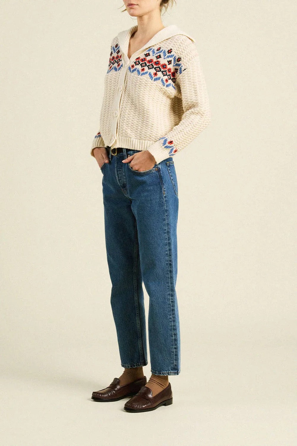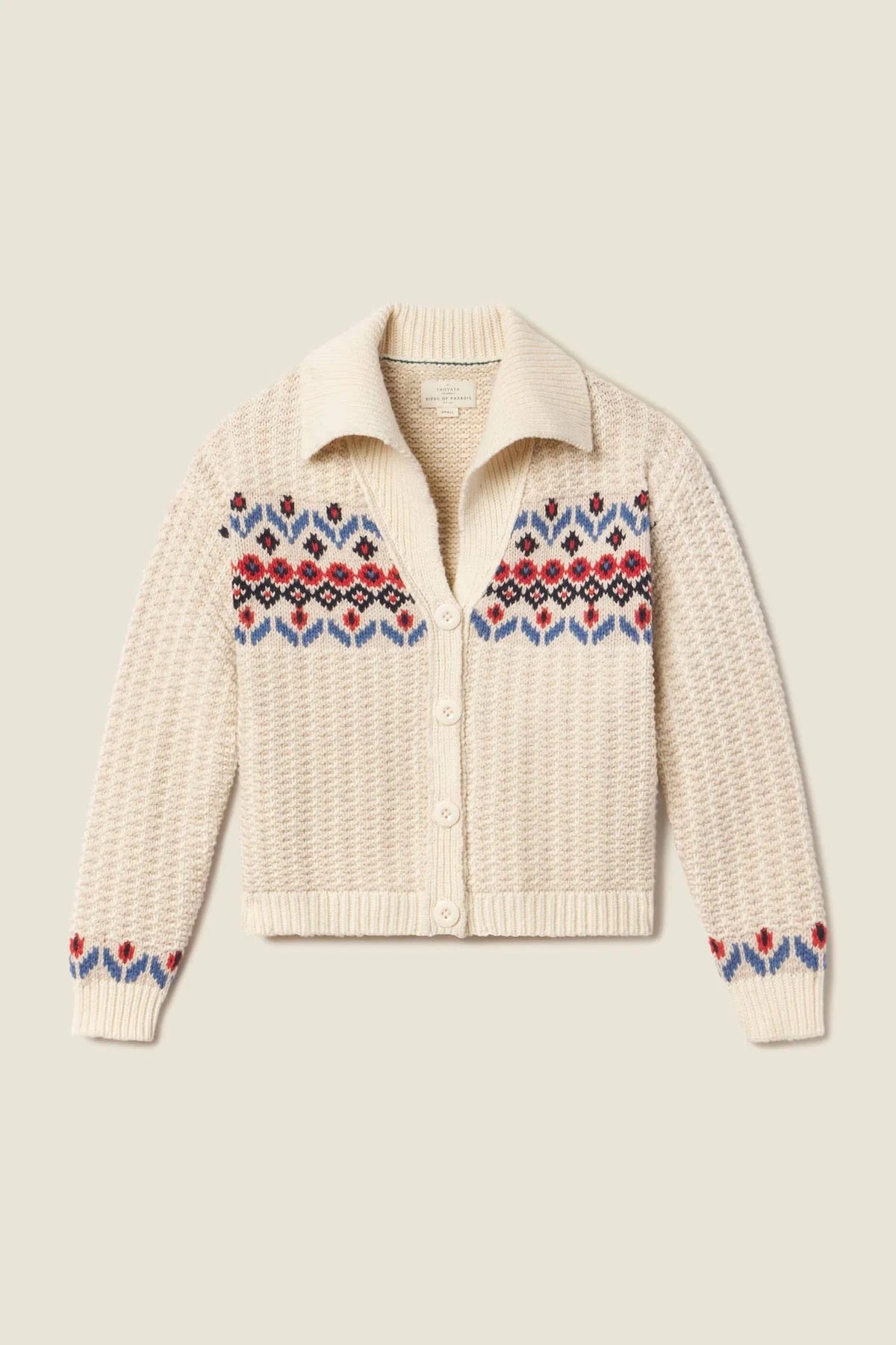 Our Savannah cardigan has a textured basket weave in antique white with complementary cream sailor collar and cuffs. Finished with our gold owl buttons. Shown here in Antique White Fairisle and made from our merino wool.