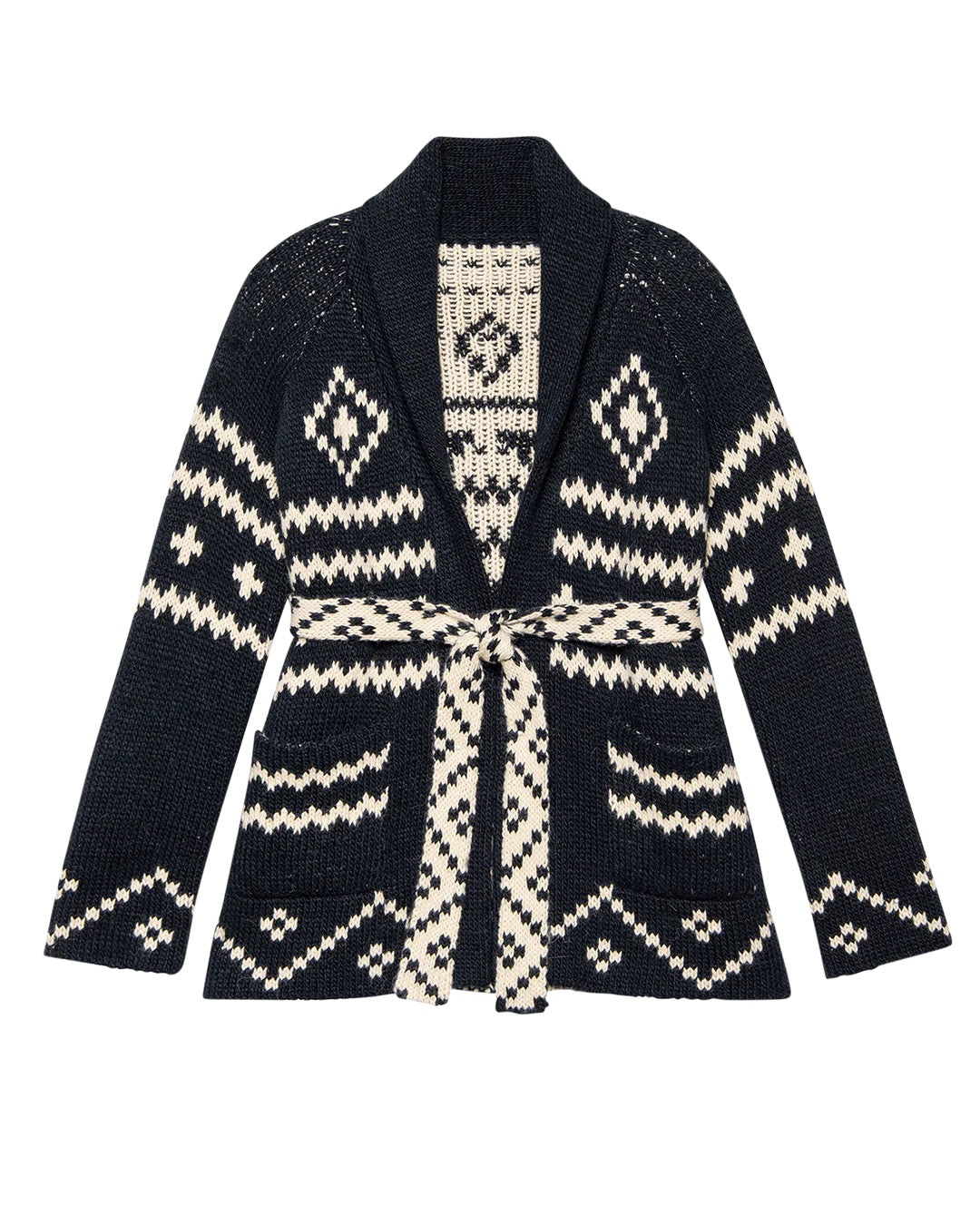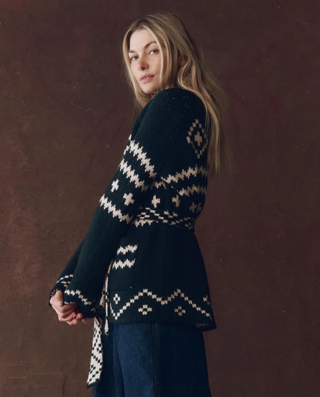 The Reversible Shepherd Cardigan is a longer-length shawl style spun from alpaca in a double jacquard technique for full reversibility. With raglan sleeves, no front closure, and a removable waist tie, it’s easy to wear two ways—on the cream side or navy side.